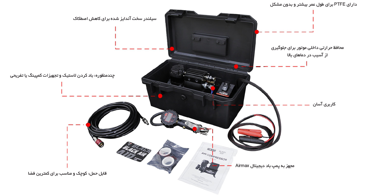 - کیت قابل حمل: شلنگ ۶ متری، گیره باتری، کیت باد و کیف حمل مقاوم